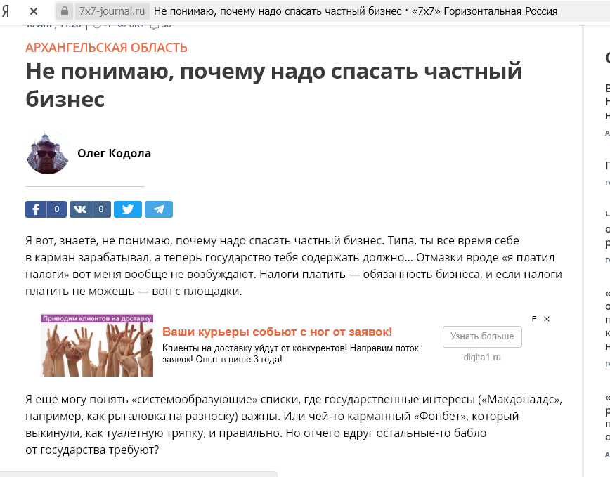 Прочитал тут недавно одного умника - Олега Кодолу. Почитал и ахнул... Чудный тип, то ли из ЕР то весеннее обострение, то ли малость 1 Канал пересмотрел. Но давайте разберемся в вопросе: а нужно ли спасать частный бизнес? Ведь, боюсь, не он один такой в нашей стране. Мой личный ответ, как предпринимателя - НЕТ! Не надо! Мало того, чтобы не было никаких сомнений - я предприниматель не из списка пострадавших от коронавируса и я не из списка системообразующих компаний. Олег Кодола, безусловно, недалекий человек. Покажите мне бизнес который просил бы чтобы его спасли? Да мы сами всех и все спасем своими руками. И себя и наших сотрудников. Дайте только возможность и, главное - не мешайте! Давайте посмотрим что получается сейчас. Олег и такие как он, к сожалению, те самые "нефтяники-государственники". Ну а кто у нас при деньгах всегда? Бюджетники - раз. Нефтяники и все что их окружает - два. Но у Олега, видимо, нет детей, нет будущего. И он не понимает, что рано или поздно, 10 или 20 лет