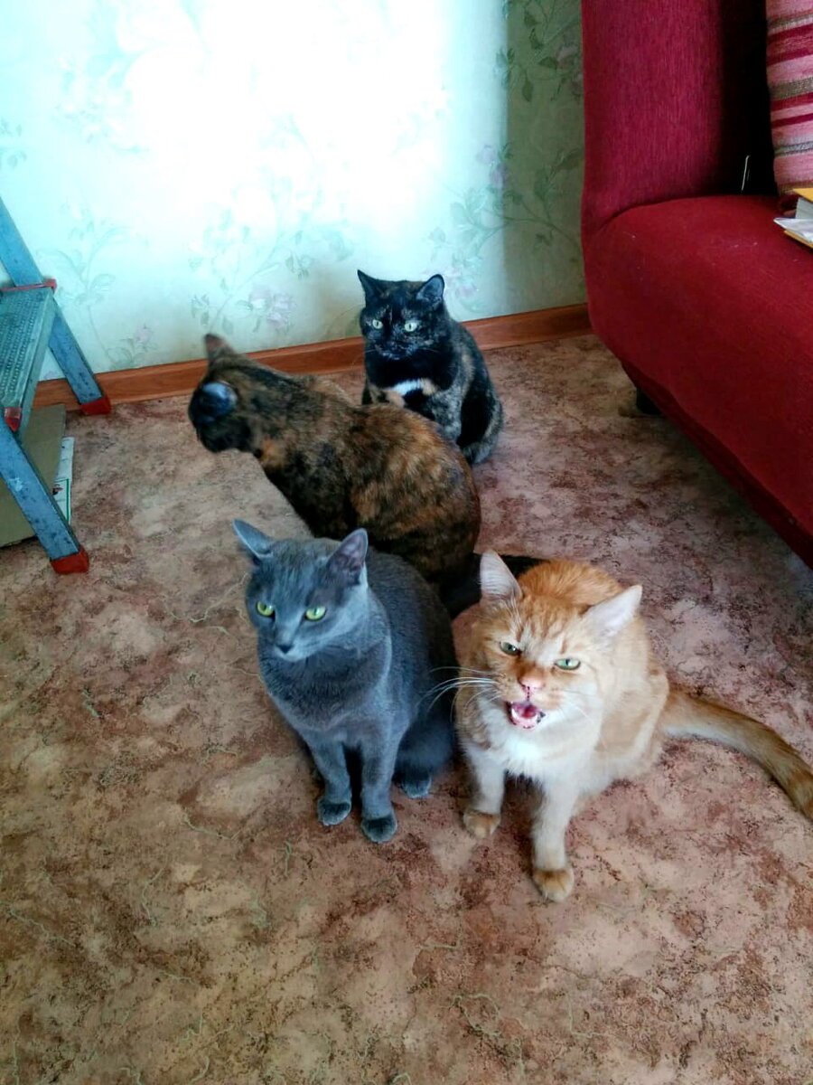 Мама содержит пятерых котов. Местами старые, местами толстые и облезлые. Один привезён аж из Норильска; не - не, никакой северной пенсии ему никто не платит. Уличных котов мама всячески поддерживает продуктами. А именно благотворительными обедами.