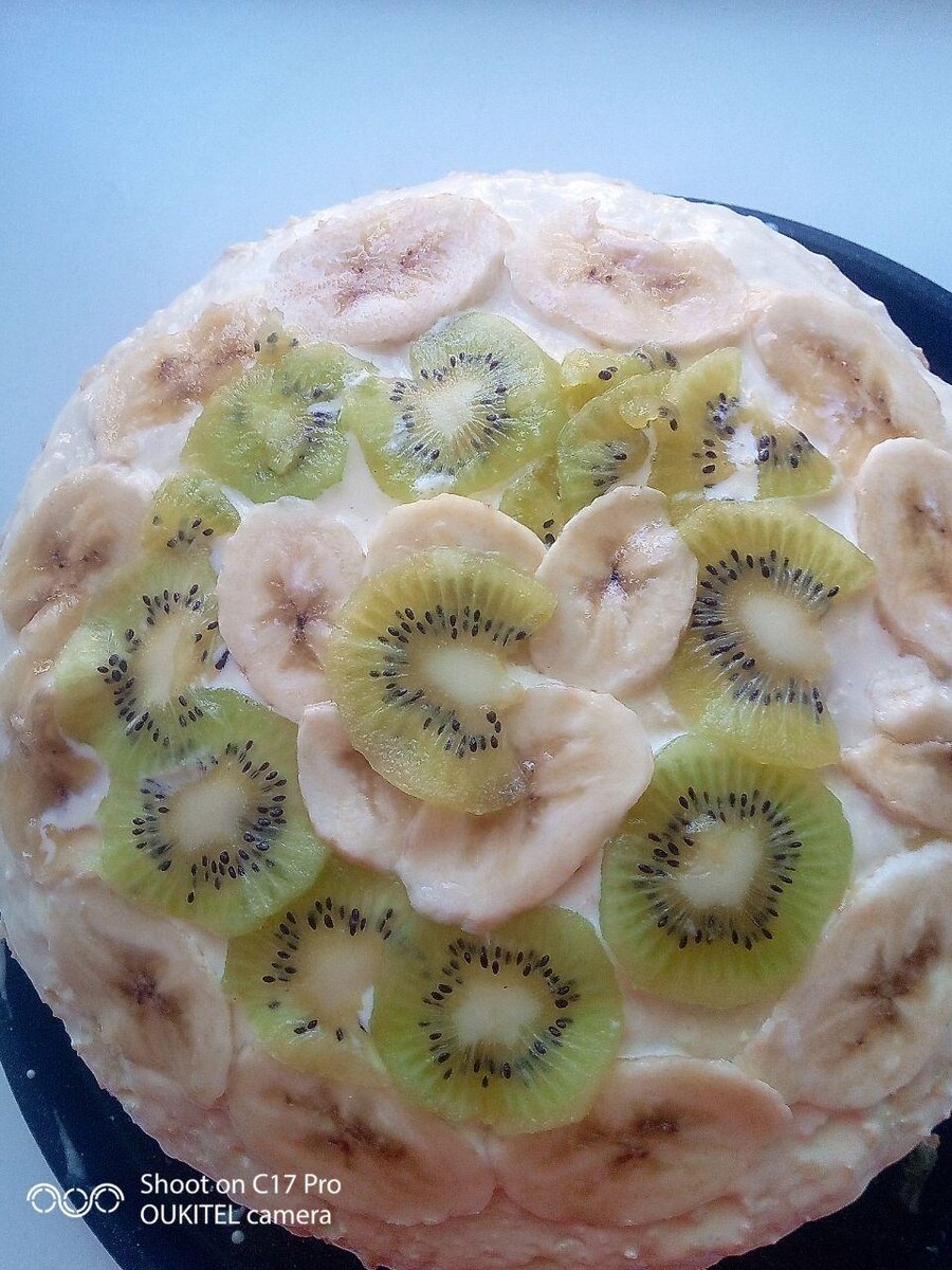 Теперь когда наш бисквит уже остыл разделяем его на 3 части. Каждую часть промазываем нашей глазурью и выкладываем банан и киви, чередуем их. Когда банан и киви выложили, сверху снова смазываем глазурью. И так собираем наш тортик. В конце обильно смазываем нашу верхушку глазурью, снова выкладываем банан и киви, и вауля наш тортик готов. Убираем его в холодильник для пропитки на 2 часа. Тортик просто обалденный)))!!!! Приятного Аппетита!!!!!