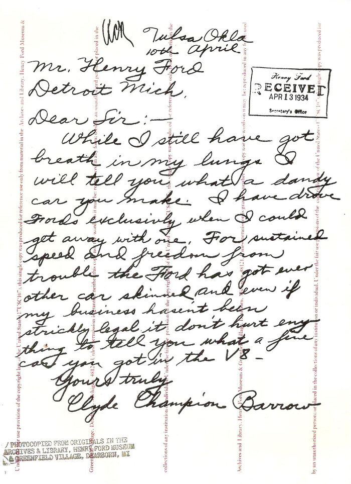 Однажды в штаб-квартиру Ford Motor Company доставили огромную кучу корреспонденции. Помимо обычных писем, там обнаружилось одно, которое сразу же было направлено Генри Форду лично в руки. Письмо написал Клайд Бэрроу, чье имя больше известно в словосочетании "Бонни и Клайд". Известнейший гангстер того времени пишет благодарственное письмо главному промышленнику Америки и восхваляет его за автомобиль, который помогает ему скрываться от полиции и ездить по всей стране. Текст письма полностью: Мистеру Генри Форду, Детройт, Мичиган Дорогой сэр! Пока в легких хватает воздуха, я должен признаться – вы делаете потрясающие автомобили! Если мне нужно угнать машину и поблизости оказывается Ford, я всегда беру именно его. В плане высокой устойчивой скорости и надежности, Ford на голову превосходит все остальные тачки. Мой бизнес, к сожалению, не назовешь особо законным, тем не менее считаю своим долгом сообщить — Ford V8 просто прекрасный автомобиль. Искренне ваш, Клайд Чемпион Бэрроу” Для тех, к