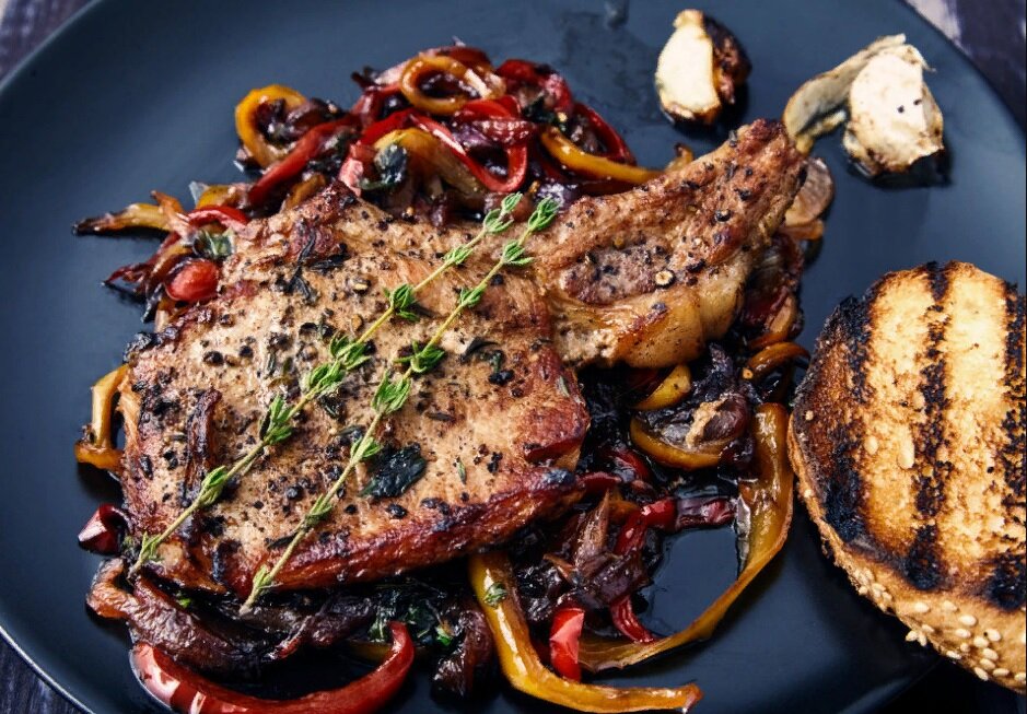 Простейший в приготовлении рецепт, удивите родных пикантным сочетанием стейка из свинины и сладким перцем. Свинина всегда была одним из самых популярных видов мяса благодаря своей мраморности и нежным вкусом. Для приготовления данного блюда вы можете использовать любимы вами отрез (лопатку, окорок, карбонат, вырезку, корейку). Свиной жир обладает особым вкусом который он приобретает после термообработки, а также не позволяет мясу пересохнуть. Для рецепта необходимы: Для начала лук и перец нужно мелко нашинковать ломтиками и полукольцами соответственно. Обжарить на оливковом масле на большом огне 3-5 минут, посолить и поперчить. Добавить 1-1,5 ст. л. сахара, уменьшив огонь, перемешать. Добавить 2 ст.л. бальзамического уксуса. Тушить до образования карамели, примерно 2-3 минуты. Снять с огня, добавить мелко нарезанный базилик, перемешать, гарнир готов. Свиные стейки посолить и поперчить, обжаривать на оливковом масле примерно 3-5 минут с каждой стороны, если есть жировая пр