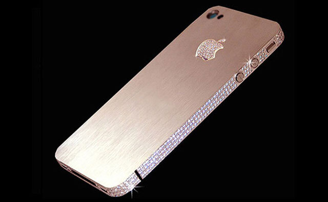 Уже знакомый нам Стюарт Хьюз потратил 5 сотен бриллиантов общим весом в 100 карат (из них, 53 шт. пошли на лого Apple, остальные – на боковую часть); торец и задняя панель покрыта розовым золотом – все это «случилось» с iPhone 4-го поколения. На лицевой панели, притягивает взгляд центральная кнопка в виде брюлика, весом 7,4 карата, еще один, на 8 карат идет в комплекте.