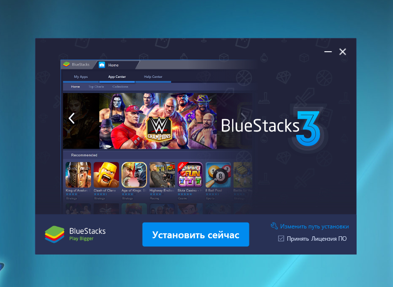 Необходимо скачать и установить на компьютер один из эмуляторов работы Android. Рассмотрим в качестве примера программу Bluestacks.