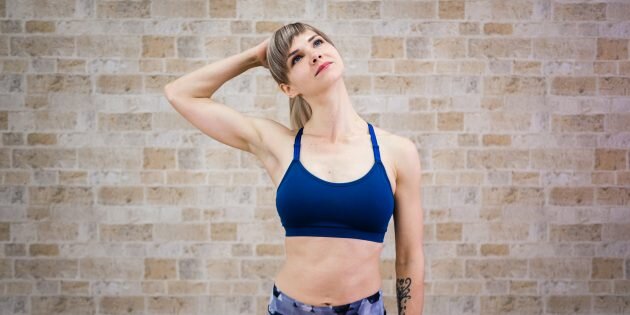 Откиньте голову назад, натягивая переднюю поверхность шеи. Из этого положения наклоните голову влево. Для большего эффекта положите левую ладонь на правую часть головы, но не давите сильно.