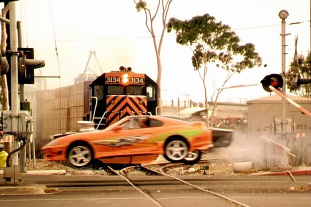 В финале первого «Форсажа» Брайан и Дом едва уворачиваются от поезда – но, хотя сцена выглядит крайне реалистичной, на самом деле автомобилям ничего не угрожало, поскольку поезда рядом с ними не было и в помине. Режиссер «Форсажа» отдельно снял автомобили и отдельно – движущийся поезд, а затем объединил эти две сцены в одном кадре в ходе пост-продакшна.