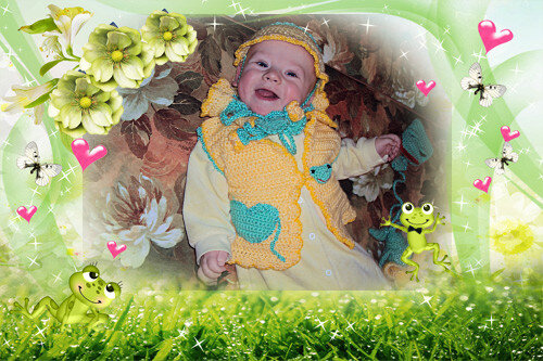 Сегодня я расскажу, как связать очень милую и нарядную безрукавку из комплекта «Веселое болотце». Для изготовления безрукавки вам потребуется детская пряжа следующих цветов: - светло – и темно – желтая; - светло – зеленая обычная и с люриксом; - Чуть – чуть черной и красной (вышить глазки и ротик на пуговке – лягушонке). Ход работы: Начинаем со спинки. Светло - желтой пряжей набираем необходимое количество воздушных петель (из расчета 1 см = 2 петли) и вяжем приемом ст.с/н. Начиная с 8-го ряда снизу провязываем по 2 ст.с/н в крайние петли через ряд, чтобы кофточка немного расширялась книзу. Затем вяжем передние половинки кофточки. Ширина одной половинки в петлях = (ширина спинки – 6 п.) / 2. Вяжем обе половинки ст.б/н и также, начиная с 8-го ряда снизу, провязываем по 2 ст.с/н через ряд для расширения. Готовые половинки пришиваем к спинке: по бокам и в плечах. В плечах пришиваем ½ часть каждой половинки. Воротничок вяжем по схеме: Начинаем зеленой пряжей с люриксом: 1-й ряд: ст.б/н; 2-