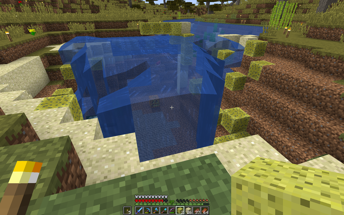 Сегодня я решил испытать в деле губки, которые вчера нашёл в подводном храме. Подходящее место у меня есть - возле фермы трезубцев нужно осушить реку, чтоб рыбы и спруты там перестали плодиться. Оказывается 32 губки это очень мало. Они моментально расходуются и нужно нести их в печь на просушку...