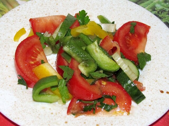 Ингредиенты для салата фитнес: Приготовление салата фитнес: Режем на красивые кусочки огурец и помидоры.Так же поступаем с сельдереем и болгарским перцем. У меня две половинки перцев разного цвета, для красоты.Листья петрушки режем не сильно мелко. Складываем все ингредиенты вместе, немного солим и перчим. Перемешиваем.Подавая на стол, заправляем порцию салата бальзамическим уксусом, по вкусу. У меня спрей, я делаю пару прысков. Можно добавить в салат рубленый чеснок или маринованный лук, вот пара рецептов, однако они разжигают аппетит. Приятного аппетита!!!