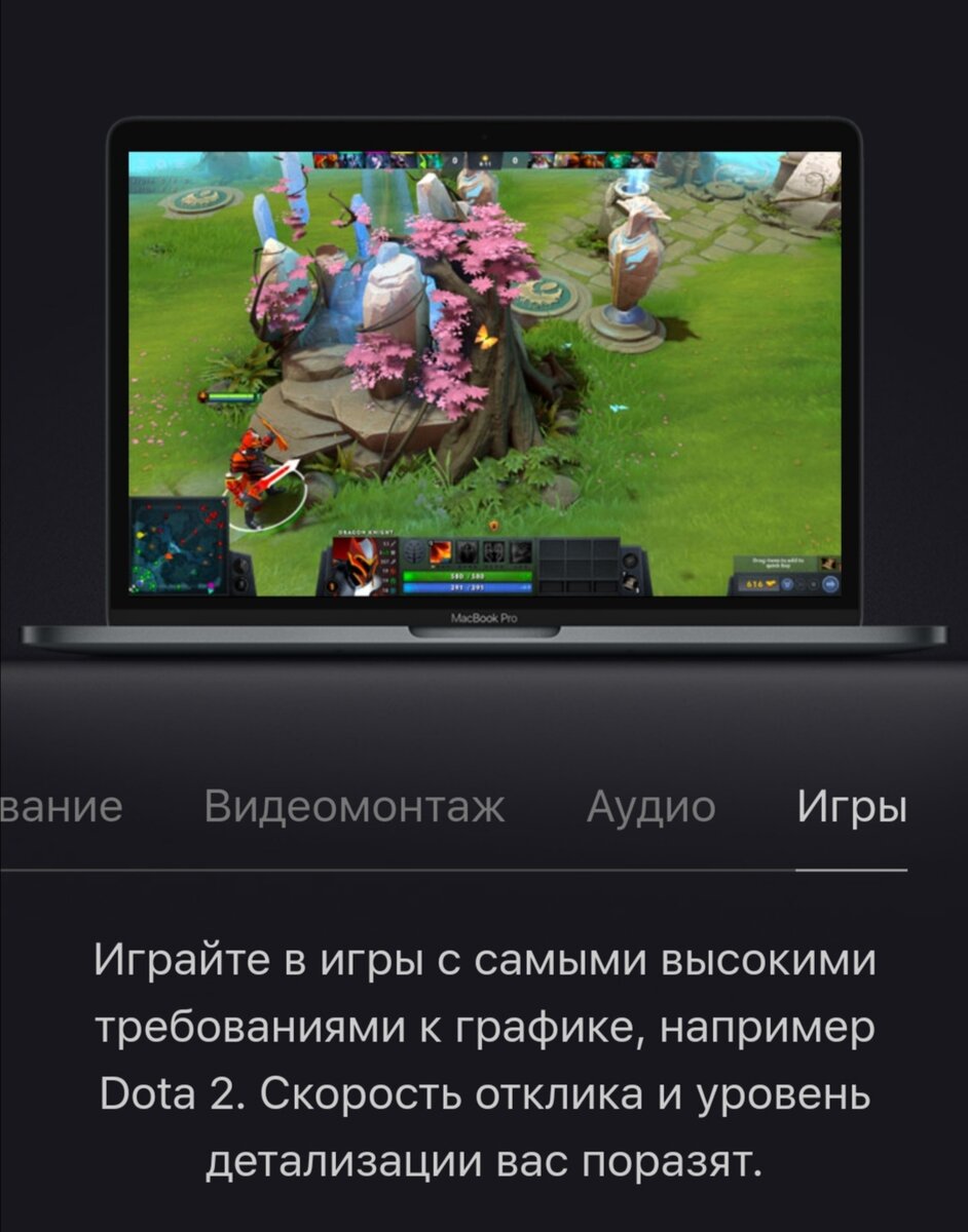 www.apple.com MacBook Pro 13″ продвигают при помощи Dota 2. На сайте Apple размещена фотография девайса, на котором запущена MOBA от Valve. В описании сказано, что на устройстве можно играть в самые требовательные к графике тайтлы. Dota 2 приведена в качестве примера. Apple: «Играйте в игры с самыми высокими требованиями к графике, например Dota 2. Скорость отклика и уровень детализации вас поразят». MacBook Pro 13″ пока не вышел в продажу, но его стоимость уже известна: разные версии можно будет приобрести по цене от ₽119 до ₽193 тыс. Помимо игры в Dota 2 на высоких настройках, Apple обещает комфортную работу в Logic Pro X, Final Cut Pro X и других требовательных к системе программах.