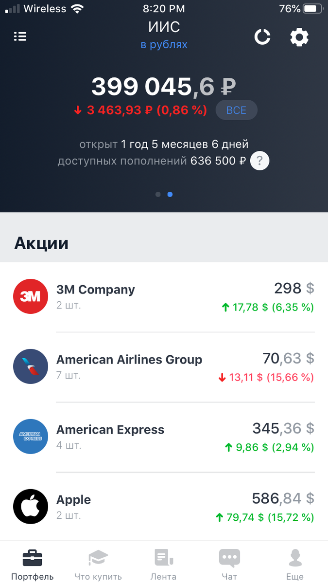 В 2018 году у меня был портфель на 300 с небольшим тысяч рублей, а потом мне пришлось продать все акции, чтобы вложить в недвижимость. Но все мы знаем, что кризис - это идеальное время для покупки акций. И вот я решил вернуть свой портфель и попытать удачу с некоторыми рискованными акциями типа Celebrity Cruises, Macy’s и различными авиакомпаниями. Бюджет: 400,000 рублей. Моя логика была следующая - если я куплю 70% портфеля со скидкой в 30%, то на остальные 30% я могу купить рискованные акции и в итоге я либо верну свои деньги, либо заработаю. Начал покупки я в марте. Вот что мы имеем на сегодня: Неплохо поднялся Apple. American Airlines пока в минусе. Рискованная ставка на Carnival и Delta. Но это часть моего плана. Если кто-то из них вернется на докризисный уровень, мой риск будет оправдан. Об акциях Walmart я писал еще до кризиса. Акции этой компании - это отличный защитный актив, который почти не просел во время кризиса и прекрасно сохранил деньги. Я очень доволен покупкой, но