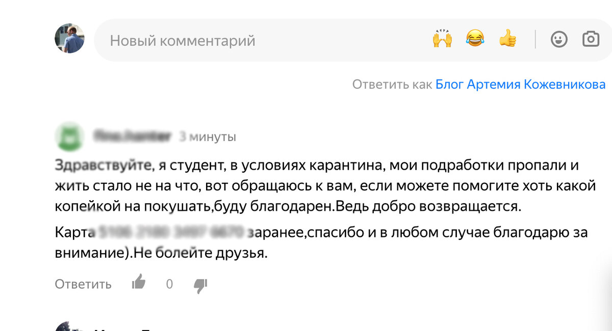 Стал часто встречать на просторах Дзена просьбы от людей, чтобы кто-нибудь пожертвовал деньги. Якобы кризис лишил доходов, жить не на что. Завелись этакие "попрошайки онлайн". Подобное обращение получил сам в комментариях в одной из своих статей. И подобных обращений сейчас много.