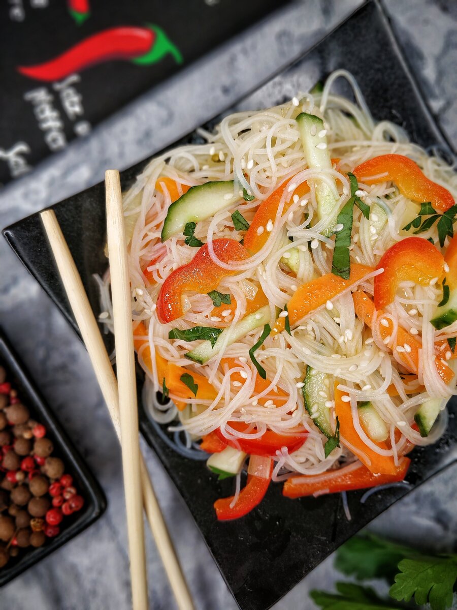 Рецепт: Салат с фунчозой Ингредиенты: 🔸Вермишель фунчоза – 1 уп. (200гр.) 🔸Соус-заправка для фунчозы – 1 уп. 🔸Морковь – 1 шт. 🔸Огурец свежий – 1 шт. средний 🔸Перец сладкий красный – 1 шт. 🔸Лук репчатый - 1 шт. 🔸Масло растительное 📊 КБЖУ в 100гр: 84/0,9/2,2/14,9 Приготовление: 1. Заливаем кипящей водой фунчозу на 5-7 минут. Затем откидываем фунчозу на дуршлаг и промываем холодной водой. Даём стечь. 2. Морковь, огурец и перец нарезаем небольшими брусочками, лук на четверть кольца. 3. Фунчоза обычно очень длинная и поэтому плохо перемешивается с овощами и ее не удобно есть. Я разрезаю длинные нити фунчозы на части ножницами. 4. В небольшом количестве растительного масла слегка обжариваем сладкий перец. Затем вытаскиваем перец и обжариваем отдельно морковь. Также вытаскиваем морковь и обжариваем слегка лук. 5. Добавляем в порезанную фунчозу обжаренные овощи и огурец, перемешиваем. 6. Заправляем салат специальным соусом для фунчозы по-корейски. Я использовала соус