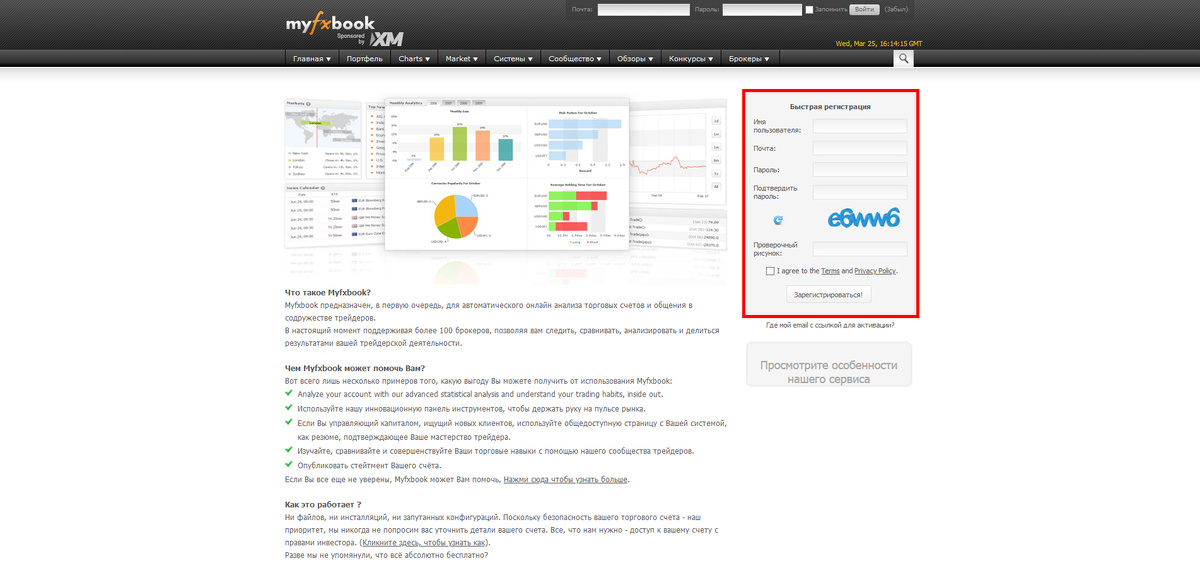 1. Регистрируемся на сайте https://www.myfxbook.com/ — вводим желаемое имя пользователя, электронную почту, пароль, капчу и соглашаемся с условиями. Затем идем в свой почтовый ящик и переходим по ссылке в письме, чтобы подтвердить свой e-mail, как обычно.