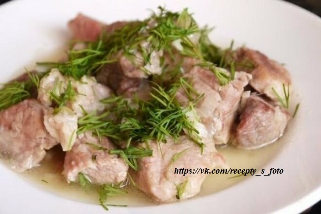 Шаг 5. Добавить молотый перец, соль, порубленный мелко чеснок. Протушить свинину с луком и чесноком 10 минут, подать с любимым гарниром, посыпать верх порубленной зеленью.