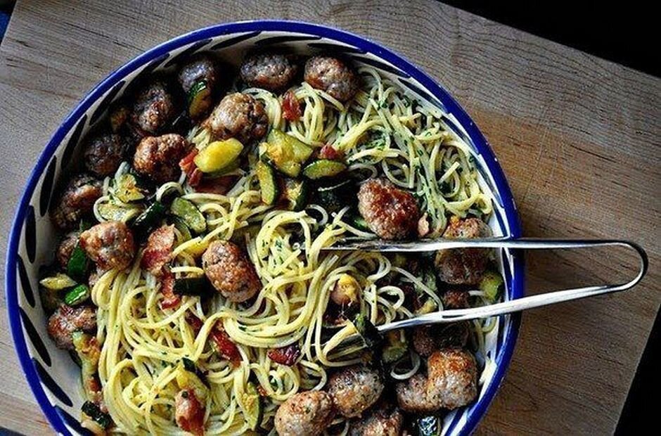 ИНГРЕДИЕНТЫ ПРИГОТОВЛЕНИЕ 1. Спагетти отварить, слить воду, оставить в кастрюле. 2. Цукини нарезать небольшими полукруглыми ломтиками, бекон измельчить. В большой сковороде обжарить фрикадельки. 3. Добавить к фрикаделькам цукини и бекон, жарит 5-7 минут, пока бекон не станет хрустящим. 4. Петрушку мелко порубить, добавить желтки и цедру лимона, перемешать. 5. В яичную смесь добавить сыр и влить сливки, взбить до однородности. 6. В кастрюлю с готовыми спагетти влить сливочно-яичную смесь. 7. Добавить пасту к фрикаделькам. Приятного аппетита!