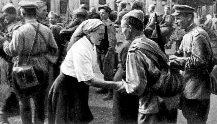 Свой взвод с Иваном догнали. Все продвигались по дороге. У всех животы от голода сводит. Вошли в какой-то населенный пункт, прямо на улицу вынесены столы. На столах огурцы грудами, котлеты на тарелках, банки наполненные сметаной. Все это богатство эстонки раздают проходящим бойцам. Все бойцы голодные, кухня как обычно за нами не успевает. Все подскакивали и со столов еду брали.