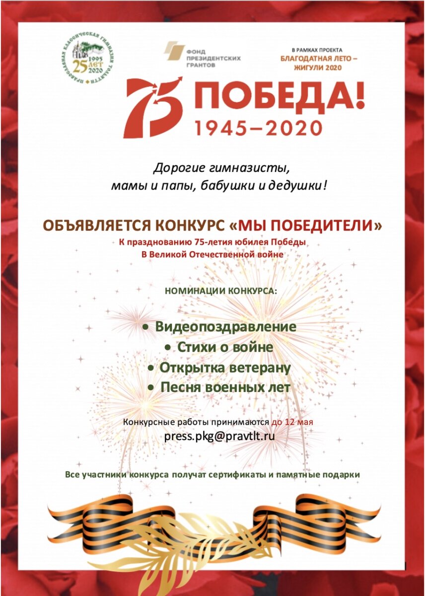 • песни военных лет Видео, аудио, фото и тексты конкурсных работ направляйте по электронной почте press.pkg@pravtlt.ru (с пометкой на конкурс). Все участники конкурса получат сертификаты и памятные подарки. Работы принимаются до 12 мая.
