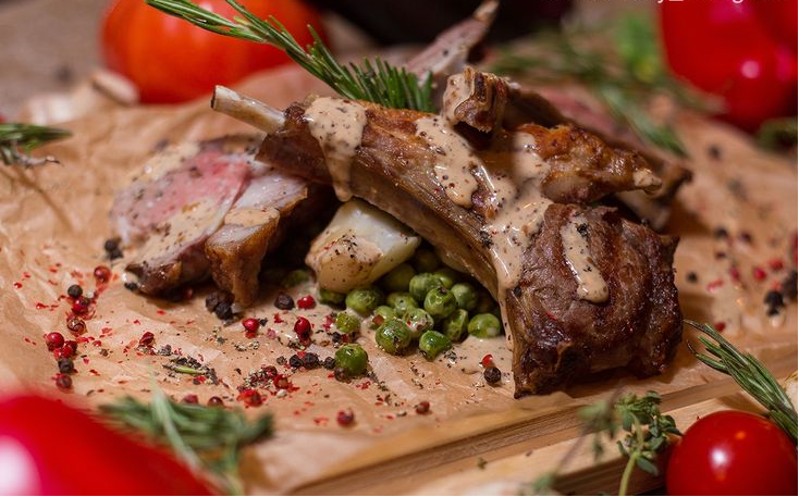 Эта часть барашка особо ценится среди гурманов ввиду своей нежности и мягкости. По сути это спинной отрез в котором присутствуют реберные кости, которые при жарке придают мясу дополнительный вкус и аромат. Готовят каре ягнёнка как целиком так и порционно, что удобнее при готовке на сковородке( все конечно же зависит от возраста животного и соответственно размера отреза). Для придания пикантности к ягнятине подаётся соус, подчеркивающий ее собственный вкус. Сегодня это будет сливочный соус. Для рецепта необходимо: Каре нарезать порционно по одному или двум рёбрам на куске. Смешать все специи с тертым чесноком и оливковым маслом. Замариновать мясо минимум на 1 час, опять же в зависимости от толщины кусков. Мясо обжарить на сковороде или гриле до нужной вам степени прожарки. Горошек обжарить 3 минуты на сливочном масле. Для соуса нужно соединить сок лимона и мяту ( если сушёная добавляйте немного, если свежая можно положить листья в сок минут на 20 потом удалить). К лимонно