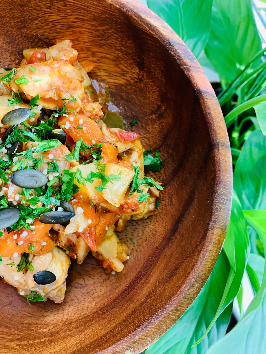Очень люблю мясо кролика за его пищевую, энергетическую ценность, оно содержит максимум белка и минимум жира, легко усваивается организмом. Благодаря диетическим свойствам, рекомендуется беременным, кормящим, детям и пожилым, очень ценно для спортсменов и тех, кто стремится к снижению веса. Я хочу вам предложить рецепт приготовления без использования молочных продуктов и картофеля, блюдо получается нежным и сочным. Здесь я использую корень сельдерея и пастернака, о пользе которых все давно забыли, а напрасно, потому что эти корнеплоды сочетают в себе массу полезных веществ в своем составе: Блюдо подходит для диет: фодмап, палео, АИП, без глютена и молочных продуктов Ингредиенты: Приготовление: 1. Возьмите ножку кролика, разделайте ее на небольшие кусочки вместе с костями. 2. Подготовьте овощи: нарежьте лук четвертинками колец, морковь полукольцами, корень сельдерея, пастернак и томаты кубиками, чеснок почистите и нарежьте мелко. 3. Растопите в кастрюле с толстым дном или сковороде (я д