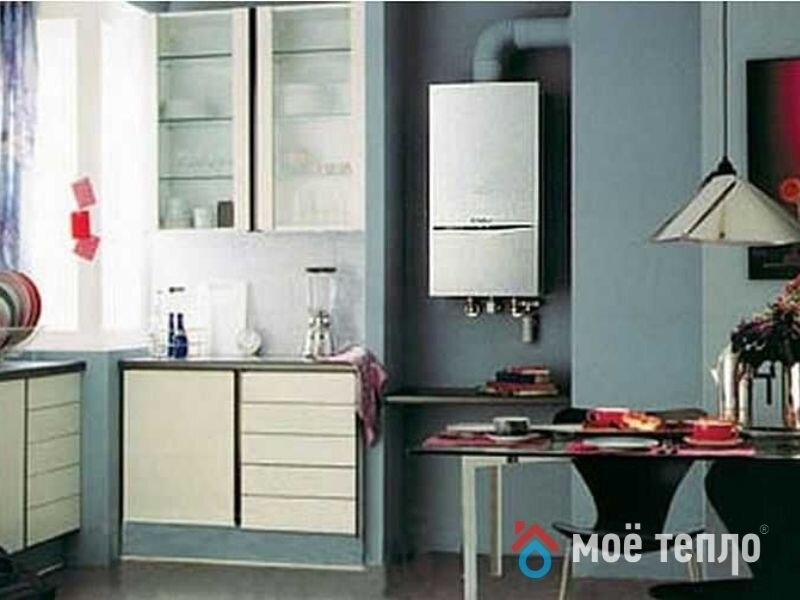 На кухонных стенах белого цвета классический котёл будет практически незаметным. Если не хочется перекрашивать стены, можно поклеить фартук. На это требуется не так много времени и денег.