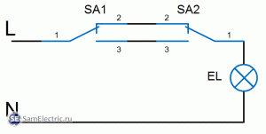 Классическая схема включения освещения из двух точек с проходными выключателями