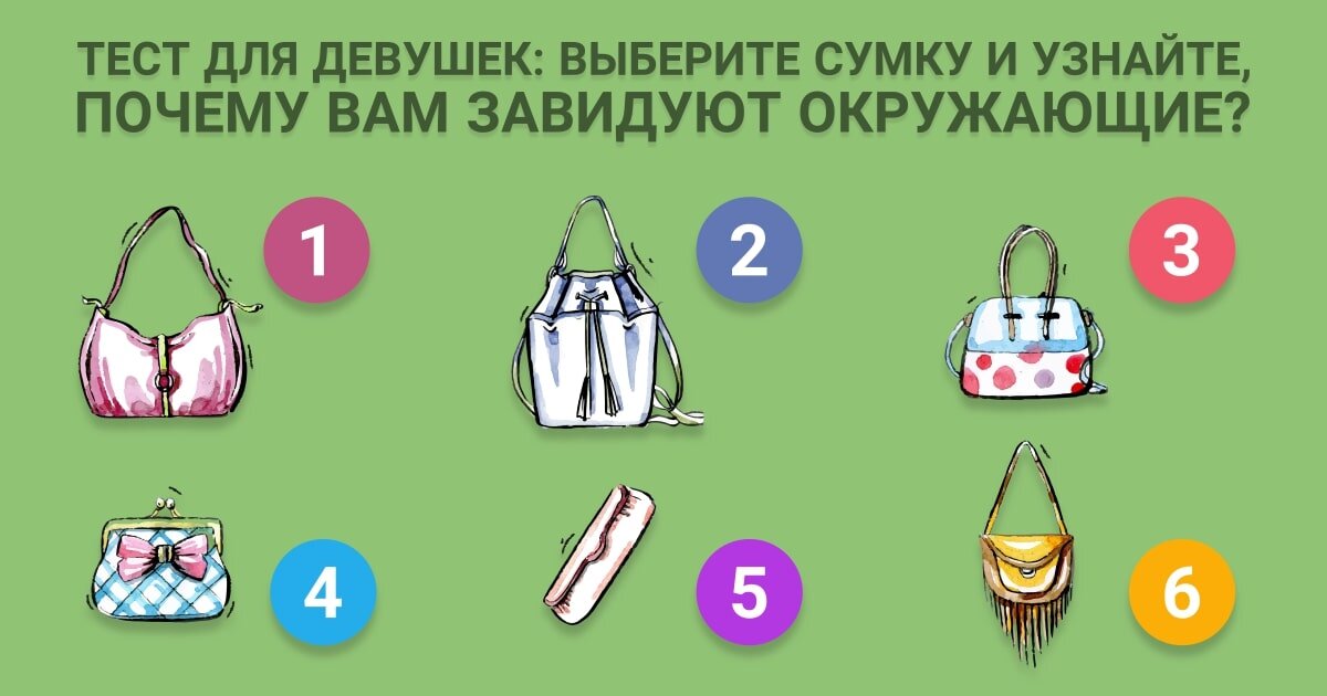 Зачастую мы видим злобные взгляды знакомых и друзей. Вот только за этой злобой или отрешённостью может скрываться самая настоящая зависть. Чаще всего это происходит в кругу общения среди девушек. Сегодня вы сможете узнать, чем же вы выделяетесь из толпы, и почему вам завидуют окружающие вас люди. Для того чтобы пройти тест, от вас требуется лишь не задумываясь выбрать ту сумочку с которой вы бы пожелали отправиться на встречу с друзьями. Ниже прочитайте советующую расшифровку. Сумка №1 Вы с лёгкостью умеете находить подход к любому человеку. Словно обладаете способностью читать мысли. Из-за этого таланта к вам тянуться люди, и при этом появляются такие особы, которые завидуют такому навыку. Вы коммуникабельный человек, отличный психолог и очень красноречивая натура. Поэтому вам завидуют многие стеснительные и зажатые по натуре люди. Сумка №2 Вы очень энергичный человек, который всегда готов к активным действиям. Сидеть на месте — это не для вас. Вы прекрасно справляетесь с любой пос