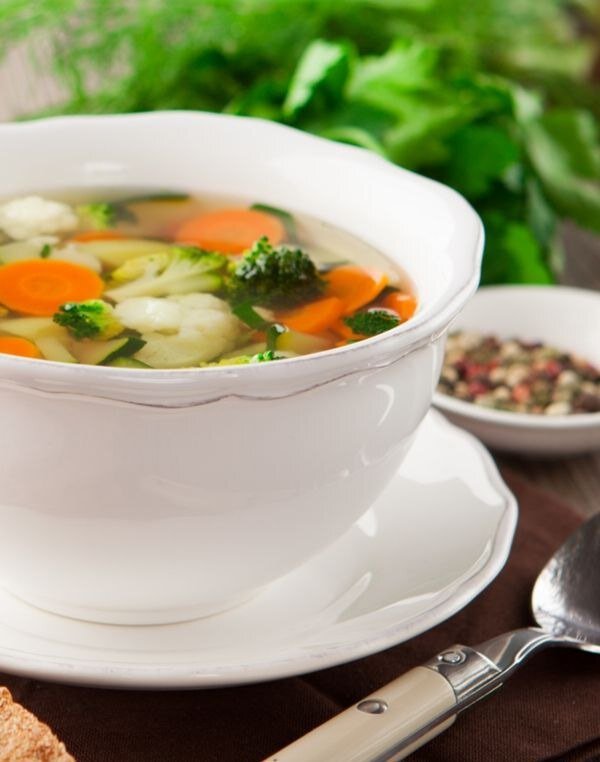 🔸на 100грамм - 12.74 ккал🔸Б/Ж/У - 0.76/0.09/2.46🔸 Ингредиенты: Брокколи - 200 гр. Цветная капуста - 200 гр. Картофель - 100 гр. Лук репчатый - 70 гр. Морковь - 70 гр. Зеленый горошек - 70 гр. Стручковая фасоль - 100 гр. Сельдерей (по вкусу) - 50 гр. Помидор 🍅 - 100 гр. Перец болгарский - 50 гр. Кабачок - 100 гр. Чеснок - 1 зуб. Зелень (по вкусу) - 2 гр. Вода - 2 л. Соль, перец черный (по вкусу) Приготовление: Разделяем брокколи и цветную капусту на соцветия, а затем выкладываем в кипящую воду. Добавляем туда же нарезанный картофель, помидор, лук и морковь. Туда же отправляется зелень, сельдерей, стручковая фасоль. Добавляем зеленый горошек, нарезанный на кусочки кабачок и перец. По вкусу посолить, поперчить, добавить чеснок и оставить вариться на медленном огне в течении 15 - 20 минут ⏰. Следите за тем, чтобы бульон был прозрачным. Приятного аппетита!