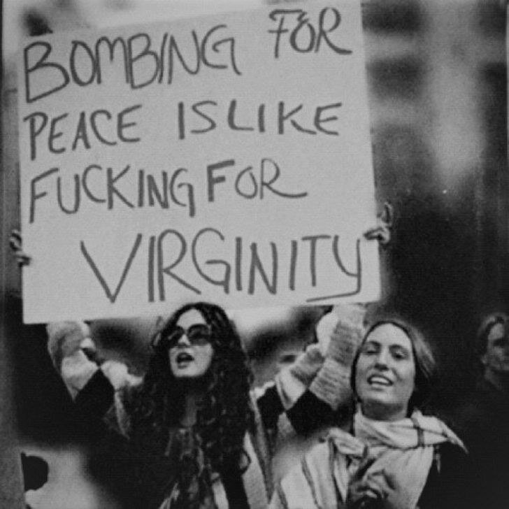 «Бомбить ради мира - всё равно, что заниматься сексом ради девственности» - знаменитый лозунг, используемый хиппи во время акций протеста против войны во Вьетнаме. 1960-е.