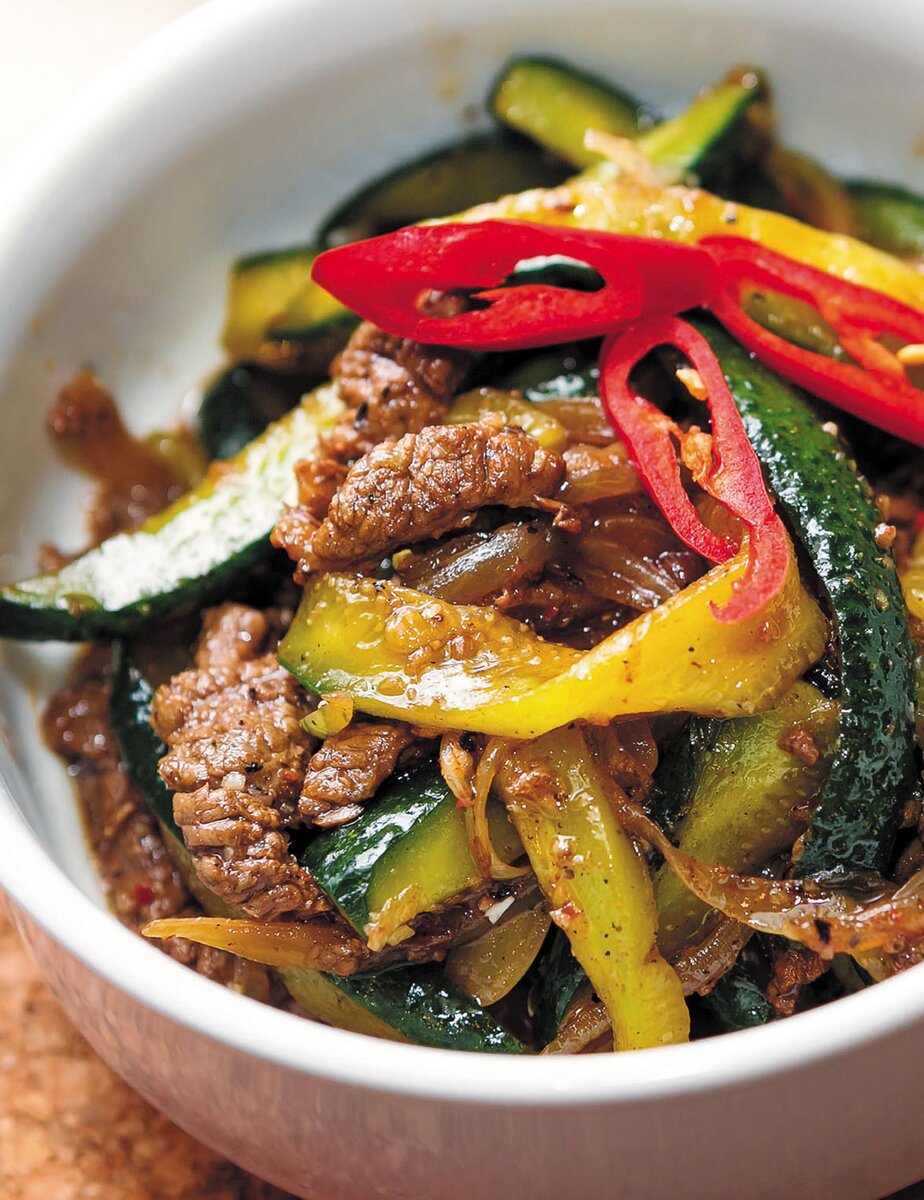 • Огурцы – 1 кг • Говядина – 300 г • Лук – 1 шт. • Имбирь – 30–40 г • Чеснок – 3–4 зубка • Острый перец свежий – 1/2–1 шт. • Молотый кориандр – 1/2 ч. л. • Острый красный перец – по вкусу • Соевый соус (светлый) – 40 мл • Темный рисовый уксус – 20 мл • Кукурузный сироп мульёт или сахар – 20 мл или 2 ст. л. с оответственно. • Соль – 2-3 ст.л. • Масло для жарки – 50 мл.