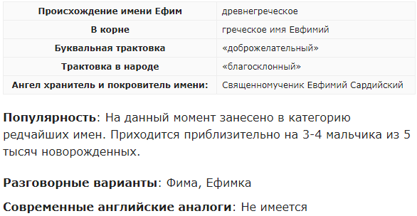 Мужское имя Ефим имеет греческое происхождение. Образовано от имени Евфимий и является его просторечной формой. Ранее в Греции так могли обращаться только к монахам или простолюдинам. Имеет трактовку «благосклонный» или «доброжелательный». Сегодня довольно часто встречается на территории России. Имеет довольно мощную энергетику, правда не всегда положительную. Для Ефима характерны несколько противоречивые качества, такие как непоседливость, капризность, подступность, обидчивость, но зато он общительный, веселый и очень дружелюбный. Однако правильное воспитание с раннего детства может воспитать в носителе имени Ефим намного больше положительных качеств. СМОТРИТЕ ВИДЕО - ПОДРОБНЕЕ ТУТ Источник - Значение имени Ефим: карма, характер и судьба