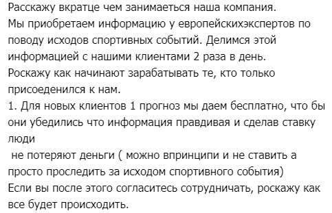 В поиске денег неоднократно попадался на людей которые предлагали зарабатывать путём ставок на подставных матчах, пришло время рассказать как же зарабатывают мошенники на простых людях. Приведу список действий типичного мошенника-ставочника: 2. Даёт один или несколько бесплатных прогнозов на договорные матчи