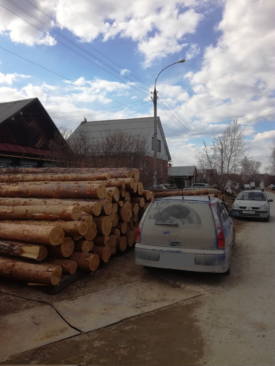 Рядом с домом навален кругляк из сосны, бревна от 25 до 40 см.