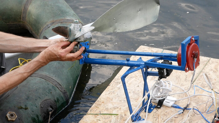 Решил попробовать собрать винтовой привод для робота - плота. Напомню, что идея - сделать девайс который сможет проплыть по заданному треку. Планируем задействовать для сплава на 3-х этажном плоту. Для экспериментов собрал из того, что было под рукой в мастерской. Винт от лодки, угловой редуктор от болгарки. Мотор от системы охлаждения авто. Поворотный мотор от привода печки.