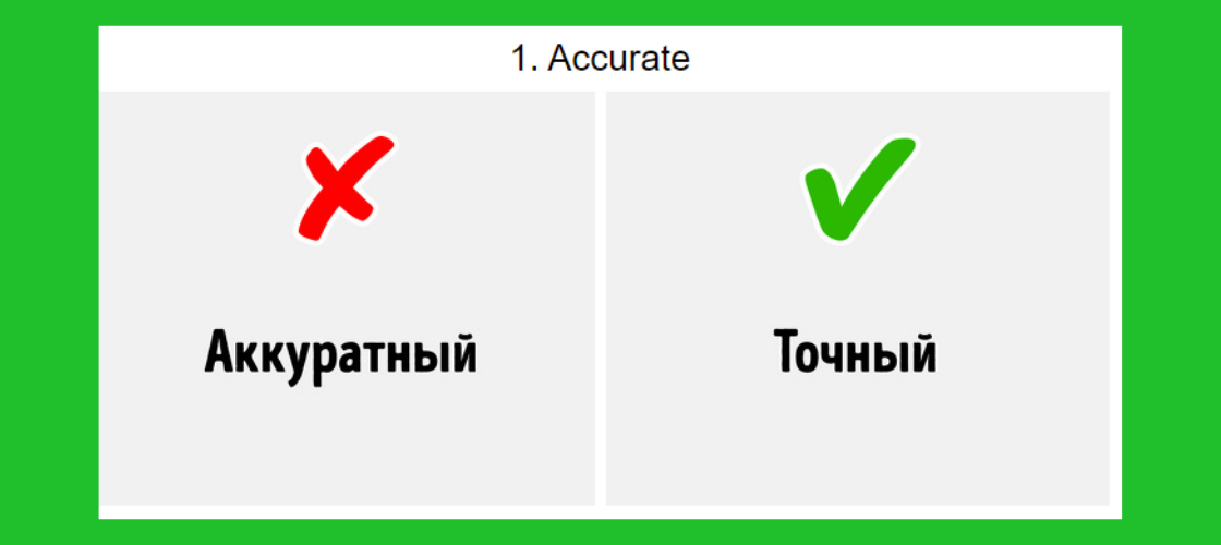 В английском языке есть слова, которые подозрительно похожи на русские. Например, university, information или mathematics. Они звучат одинаково и означают одно и то же в обоих языках. Но есть слова, которые звучат одинаково, а вот перевод может значительно отличаться, что может поставить вас в очень неловкое положение… Лингвисты называют эти слова межъязыковыми омонимами или ложными друзьями переводчика. Accurate Всегда хочется похвалить себя за аккуратность, но если вы сделаете это при помощи предложения «I’m a very accurate person», то расскажиет окружающим, что вы «очень точный человек». Странновато звучит не такли…? Аккуратный означает tidy, а accurate значит точность или правильность: Angina В русском языке слово «ангина» означает боль в горле, а в английском - это стенакордия, боль в груди. Если у вас болит горло, то говорите sore throat. Artist Мы артистами считаем всех служителей сцены: певцов, актеров, комедиантов. А вот англоговорящие люди подразумевают под словом «artist