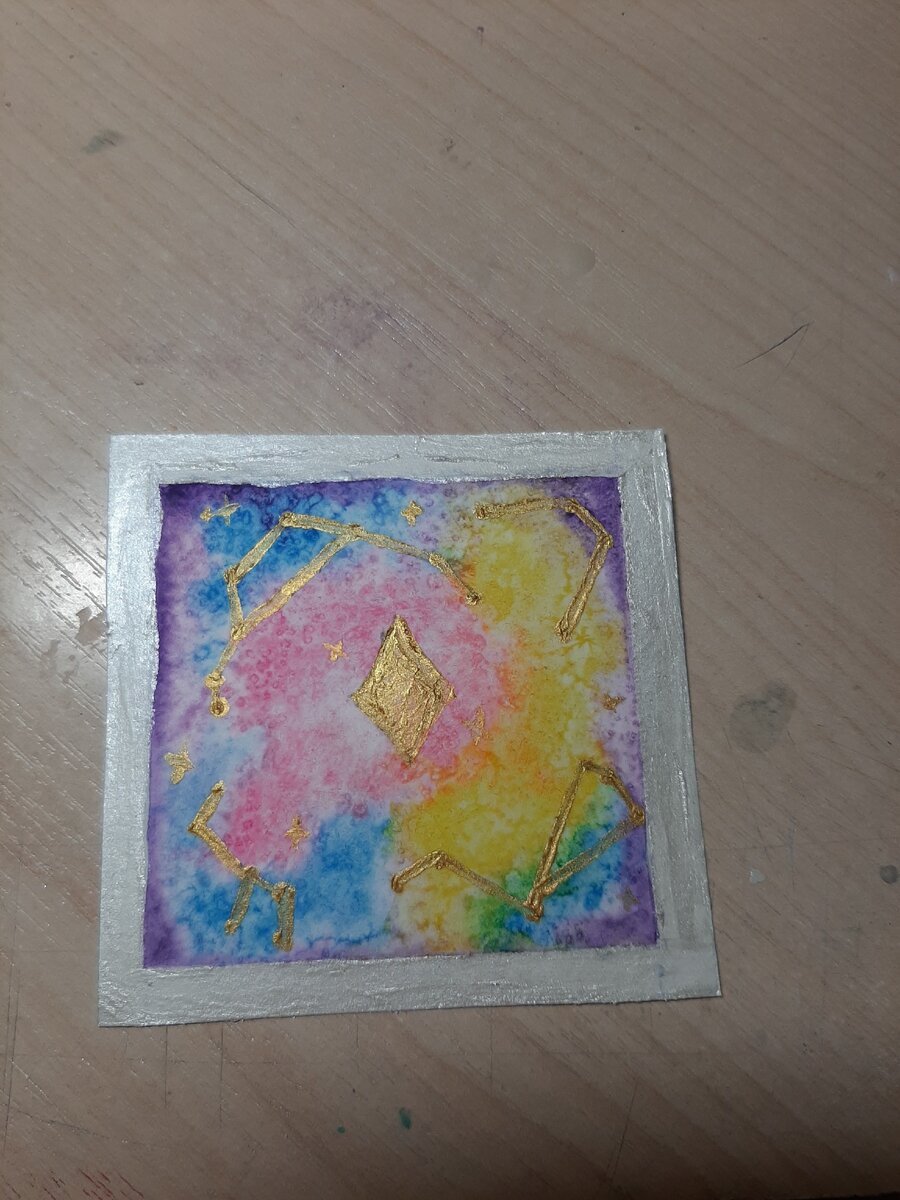 Для начала нужен лист акварельной бумаги, акварель, крупная соль и кисть для росивания . Лист аквалельной бумаги нужно попрыскать водой . Для этого рисунка понадобится: светло сиреневый, фиолетовый, Жёлтый, розовый и голубой- цвета акварели. По краям размазывает светло сиреневый цвет . По самым краям добавляем фиолетовый. По середине добавляем розовый . Добавляем голубой между розовым и сиреневым. Теперь между розовым и сиреневым добавляем жёлтый. Там где будут белые пятна добавьте сиреневый. Посыпаем рисунок крупной солью. Ждем пока высохнет. Стряхеваем соль с листа. И рисуем звёзды и точки золотой краской. Точки нужно соединить, чтобы получились созвездия . Снимаем полярный скотч и обводим рисунок серебряной краской или оставляем как есть. Готово!