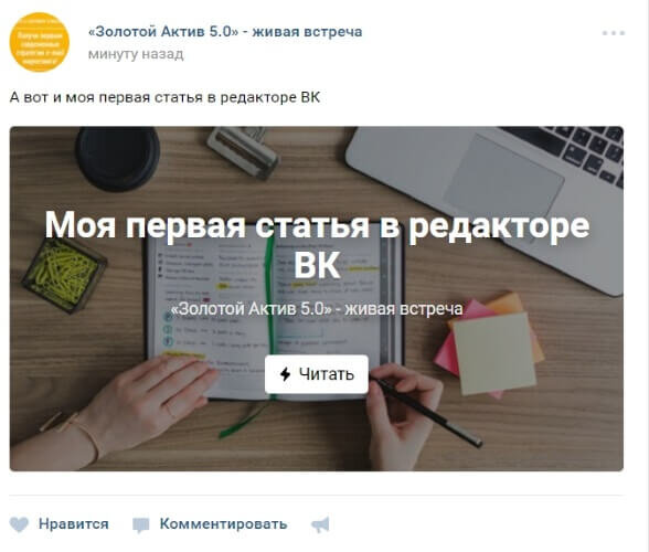 После того, как вы нажали по кнопке «Опубликовать», увидите ссылку на свою статью, которой можно поделиться с любым пользователем. Чтобы эта статья появилась на стене профиля или сообщества, нужно нажать «Прикрепить к записи» – тогда ее увидит ваша аудитория.