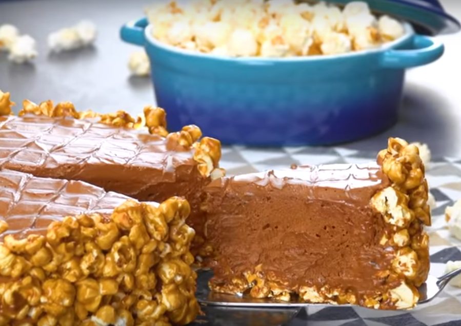 Предлагаем вам приготовить шоколадный десерт без выпечки с карамелью и попкорном. Он прекрасно подойдет для семейного чаепития при просмотре фильма и даже к праздничному столу.Тортик получается очень красивый, интересный на вкус и довольно необычный. Необходимые продукты Для карамели Для шоколадного мусса Для глазури Начинаем приготовление Попробуйте также очень вкусный торт без муки. Приготовить его можно по рецепту с нашего сайта. Приятного аппетита!