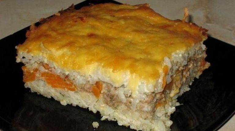 Мясо свинины-500гр Рис-500гр Лук-3 шт Морковь-3 шт Яйцо-6 шт сливочное масло-100гр Соль,перец-по вкусу. Предварительно не доваренный рис ,добавляем яйца,все перемешиваем,далее обжариваем лук и морковь, отвариваем мясо измельчаем его вилкой. Смазываем противень или форму выкладываем первым слоем рис, далее вторым слоем овощную зажарку, потом мясо,затем снова зажарку и наверх рис. Верх запеканки смазываем яйцом с сливочным маслом. Выпекаем до готовности в предварительно разогретой до 200 градусов духовке.Подавать с зеленью и сметаной.Приятного аппетита.