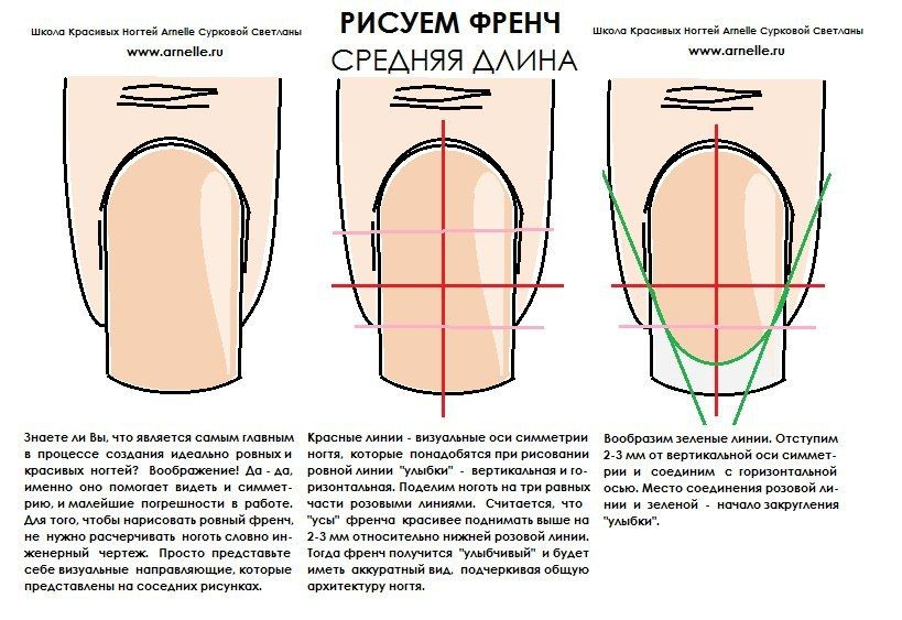 Неправильный французский маникюр сделать довольно легко, достаточно просто не знать как правильно рисовать линию улыбки. Чтобы правильно нарисовать линию улыбки, необходимо рассчитать ширину линии улыбки по специальной формуле. Иначе, в противном случае, будет выглядеть так, будто у тебя был однотонный белый маникюр, а потом он резко отрос.