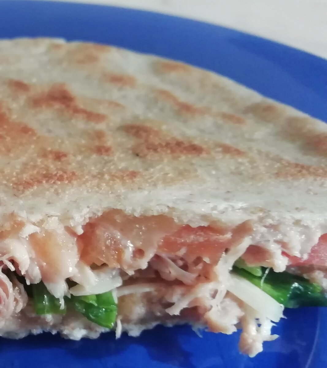 Кесадилья - блюдо латино-американской кухни на которое я реагирую как Гомер Симпсон на пончики. Давно хотела приготовить ее дома, и вот возможность - с бульона осталось куриное мясо, а на кухне пита. В оригинальном рецепте курица обжаривается в сыром виде, используются лепешки тортильяс, добавляется болгарский перец (которого тоже не было) и чеснок (он обжаривается с перцем, курицей и помидорами). На 2 порции: Пита цельнозерновая - 2 шт. Курица вареная - для начинки Помидоры - 2 шт. Сыр - по вкусу Лук репчатый - по вкусу Соль - по вкусу Перец - по вкусу Технология 1. Помидоры залейте кипятком и оставьте на 8-10 минут. 2. Натрите сыр на терке. 3. Нарежьте лук. 4. Очистите шкурку с помидоров. 5. Мелко нарежьте помидоры. 6. Налейте на сквовородку растительное масло, слегка обжарьте помидоры. 7. Посолите, поперчите, добавьте вареную курицу, перемешайте и немного обжарьте. 8. На питу разрезанную на две части и добавьте ингредиенты в следующем порядке: сыр, курица с помидорами и