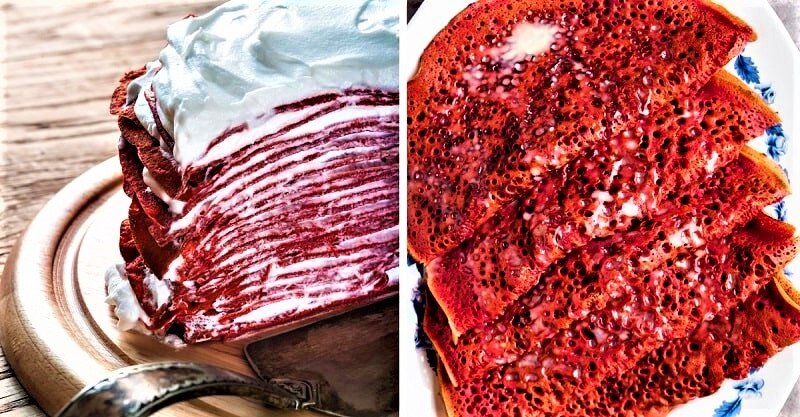 5. Пришло время приготовить вкусный крем для блинов. Сливки сбиваем вместе с сахарной пудрой. К ингредиентам добавляем сливочный сыр. Мешайте смесь медленными движениями. Теперь будем украшать само блюдо. На большую тарелку выкладываем блин и обмазываем его кремом. Далее проделываем те же шаги, то есть строим башню из блинов. Как только вы закончите с тортом, положите его в холодильник на четыре часа. Блинный торт «Красный бархат» готов!