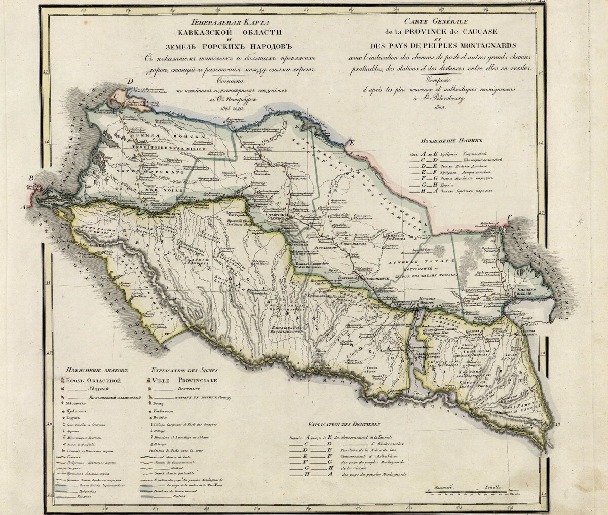 Перед вами «Генеральная Карта Кавказской Области и земель горскихъ народовъ Съ показанiемъ почтовыхъ и большихъ проѣзжихъ дорогъ, станцiй и разстоянiя между оными верстъ».