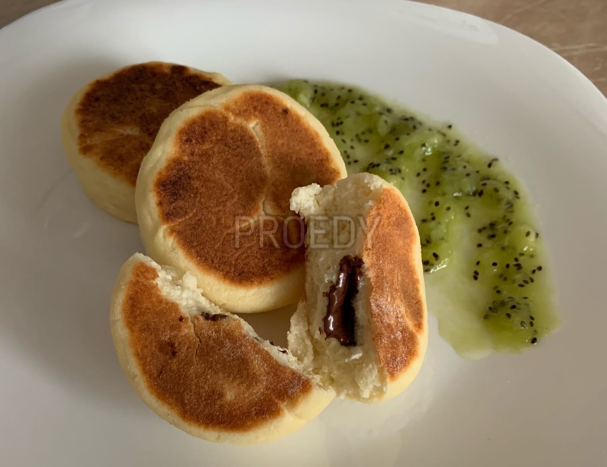 Сырники (творожники), а в простонародье жареные лепёшки из творога. Я думаю многие помнят этот незабываемый вкус детства. И я решила поделиться с Вами своим рецептом сырников. Ингредиенты: Способ приготовления: Смешать творог, яйца, сахар и разрыхлитель. С помощью погружного блендера перемешиваем все ингредиенты. Добавляем муку (не всю! маленько оставляем для обваливания сырников) и все хорошо перемешиваем ложкой. Смачиваем руки и начинаем формировать из смеси шарики, во внутрь добавляем дольку шоколада. Обваливаем их в муке, со всех сторон. И начинаем с помощью стакана формировать наши сырники в виде шайбочек шайбочек. На сковороду добавляем небольшое количество растительного масла и нагреваем сковороду. Обжариваем сырники с двух сторон под крышкой до готовности. P.s.- так же можно приготовить сырники в духовке. ПРИЯТНОГО АППЕТИТА!