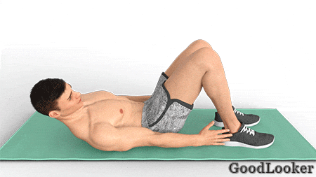 Лягте на спину, поясница прижата к полу. Согните ноги в коленях и оторвите плечи от пола. Начните скручиваться в корпусе, стараясь дотянуться кончиками пальцев до одноименной стопы – как будто делаете наклоны в сторону. Выполняйте это простое упражнение для живота поочередно в правую и в левую сторону.