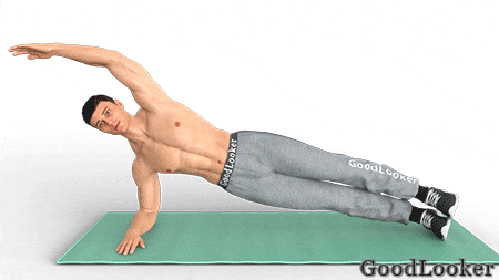 Встаньте в положение боковой планки на предплечье, как было описано выше. Свободную левую руку поднимите над головой. Выполняйте скручивание, подтягивая левую руку к левому колено. В этом упражнении сочетается статическая и динамическая нагрузка, которая очень полезна для тех, кто хочет убрать живот. Начинающие могут поднимать ногу вверх, а руку положить на талию или вытянуть вертикально вверх – так будет легче держать равновесие. Не забудьте выполнить упражнение на обе стороны.