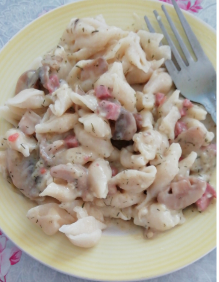 Макароны можно использовать кто какие любит, я использую ракушки. Все ингредиенты беру на глаз, кто как больше любит, так и добавляет. Для подливы нужно: грибы шампиньоны замороженные, сосиски или колбаса, чеснок, мука, сметана, сырок плавленный, зелень (лук, укроп) можно сушенную, сливочное масло для жарки. Для начала обжариваем грибы на сливочном масле, пока жидкость не выпарится, затем добавляем нарезаные кубиками сосиски или колбасу, следом выдавливаем зубчик чеснока, чуть обжариваем, чтобы сосиски поджарились, затем добавляем в эту смесь муку (примерно 2 ст. ложки), буквально несколько секунд обжариваем и добавляем немного воды, солим по вкусу. Все перемешиваем и натираем в сковороду сырок, перемешиваем, добавляем сметану (примерно 3 ст. ложки, можно и больше), доливаем еще воды (примерно стакан) и посыпаем зеленью. Ждем когда все закипит и буквально через 2-3 минуты выключаем. Готово! Отваренные макароны сдобриваем сливочным маслом. Выкладываем макароны в тарелку и добавляем по