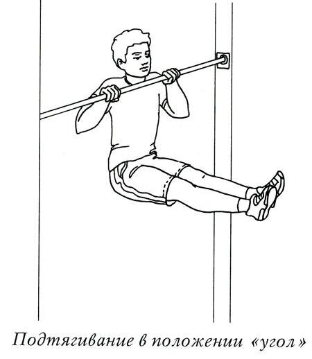 Исходное положение: стоя. Подтянуться подбородком выше перекладины, медленно поднять прямые ноги до положения «угол», опустить. Упражнение повторить несколько раз.