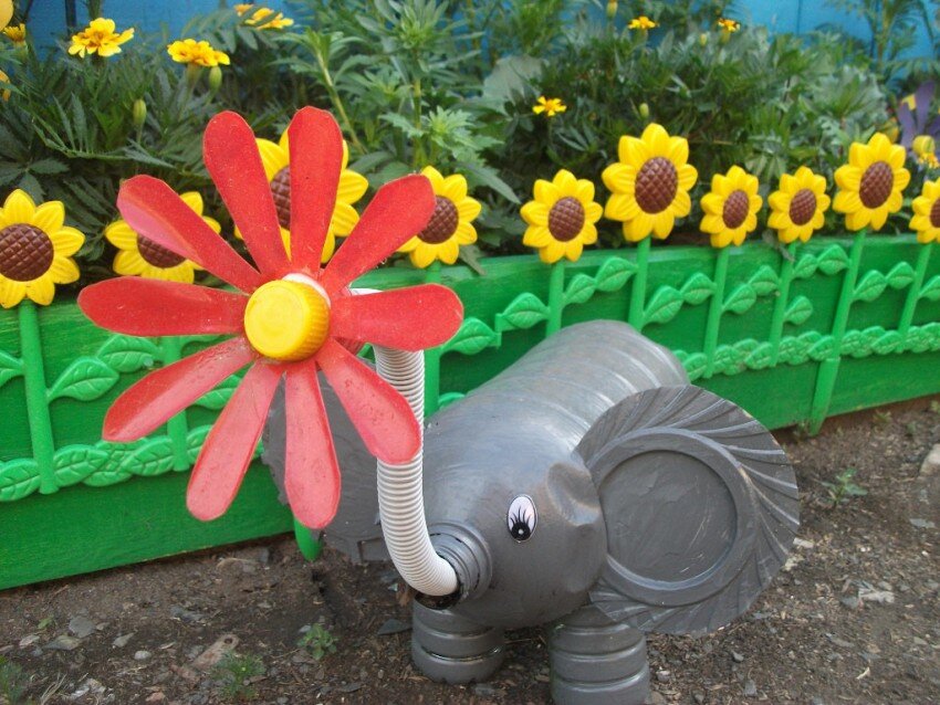 Красиво оформить сад, огород или двор помогут разнообразные поделки, сделанные своими руками. В качестве полезного сырья при сооружении украшений может быть использовано абсолютно все. Просто проверьте, что у вас завалялось на антресоли, в сарае или на чердаке. Все эти старые ненужные предметы могут получить шанс на новую жизнь. Создание поделок для огорода можно начать, посмотрев фото различных мастеров. В современном мире чего только не найдешь для того, чтобы сделать двор уютнее. Вот что может пригодиться при сооружении поделок: старые шины, бутылки, жестяные банки, остатки стройматериалов, сломанные приборы, старая одежда и даже битая посуда. Идеи поделок из пластиковых бутылок Многие поделки для огорода и сада принято изготавливать из старых пластиковых бутылок различных размеров. К примеру, бутылки можно покрасить, обрезать горлышки и сложить из них небольшую оградку для клумбы. Еще один вариант — это цветы. Из бутылок получатся подсолнухи, ромашки, тюльпаны и еще множество