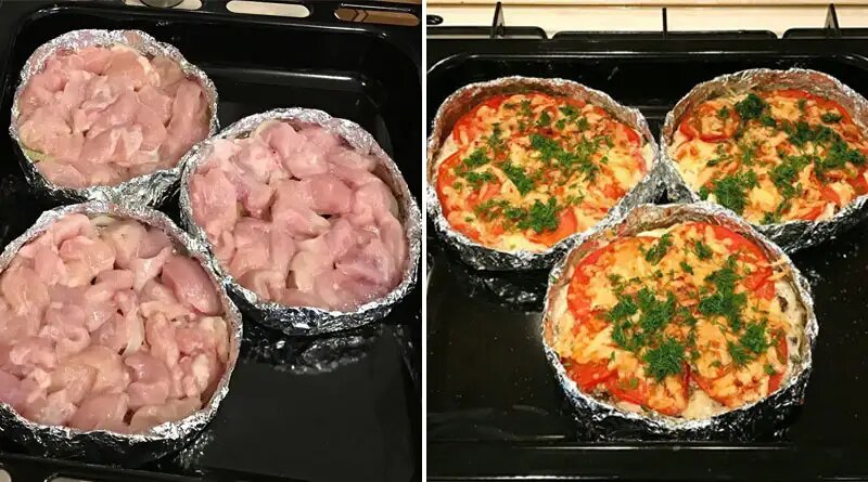 Зелень для украшения Приготовление Курицу нарезать на кусочки среднего размера. Залить молоком и оставить на 1-1,5 часа, это сделает курицу мягче. Подготовить формы из фольги, для этого просто несколько слоев фольги сложить вместе. Сверху поставить трёхлитровый баллон и поднять края фольги, чтобы она приняла нужную форму. Поставить формочки на противень, каждую смазать растительным маслом. Картофель нарезать тонкими кусочками, разложить по формочкам, посолить, поперчить. Сверху выложить тоненько порезанный полукольцами лук, затем мясо, снова поперчить и посолить. Приготовить заливку: яйца взбить со сметаной, полить этой заливкой
