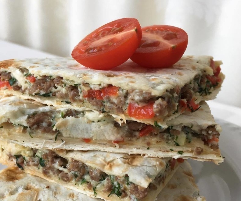 5. На разогретую сковороду выложить лаваш, его края должны немного свисать. Подержать полминуты и в центр выложить начинку. Завернуть края лаваша и еще немного смазать молоком.
